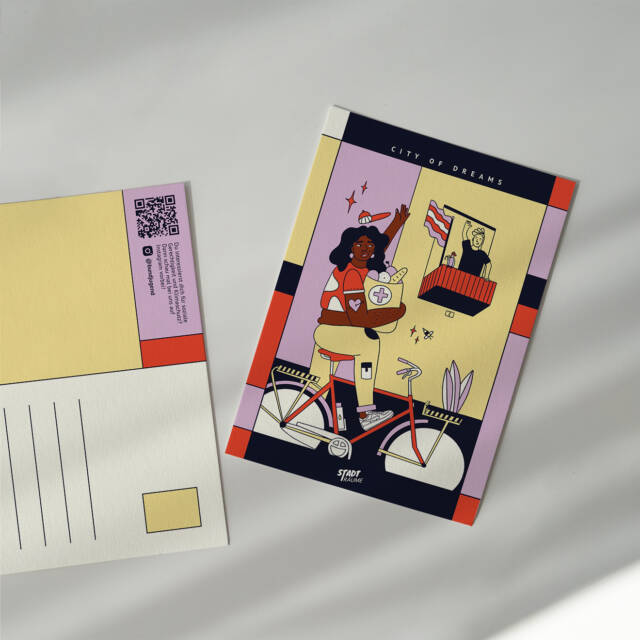 Diese coole Postkarte gehört zu unserer Kollektion „City of Dreams“, die zusammen mit unserer wunderbaren Illustrator*in @el.boum im Projekt Stadträume entstand.